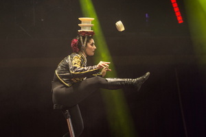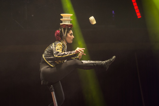 Verschiedene Einräder setzt Kelly Folco in ihrem Auftritt ein. Zunächst springt sie auf dem Rad eine Treppe hinauf und auf dem Podium Seil. Nach dem Wechsel auf ein Stangenrad befördert die junge Frau Unterteller und Tassen per Fußkick auf ihren Kopf, wo sie sich zu einem Turm stapeln. Schließlich bringen vier Herren eine monströse Rad-Konstruktion in die Manege. In einem Metallrahmen sind fünfzehn Räder übereinander unter dem Sattel angeordnet. Das Gerät wird nicht über eine Kette angetrieben sondern die Adhäsion der Reifen überträgt die Kraft und sorgt für Vortrieb wenn die Artistin in sehr großer Höhe eine Runde um die Manege fährt.