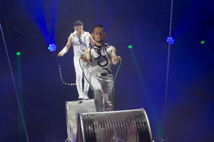 Für Nervenkitzel und Adrenalin pur sorgt das Duo Ortiz vor der Pause mit seinen verwegenen Aktionen auf dem Todesrad. Mit verschiedenen Sprüngen in den Kesseln starten die beiden Südamerikaner ihre Performance. Dann geht es nach außen. Seil springen und Blindlauf erfolgen in erstklassiger Manier, ehe hohe Absprünge auf der Außenbahn vielen Zuschauern feuchte Hände bescheren.