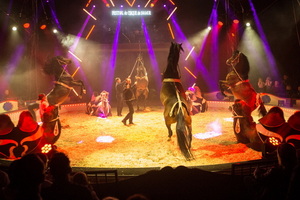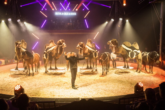 Ein Programm-Highlight und equestricher Leckerbissen ist zu Beginn des zweiten Programmteils zu genießen. In einer neuen Dressurschöpfung vereint Franz Renz jr. vier Steppenkamele und vier junge Araberhengste zu einer formidablen Gruppe. Ruhig und gekonnt führt der erfahrene Dresseur die Chambriere und lässt die vielseitigen Figuren elegant ablaufen. Die große Auswahl anspruchsvoller Abläufe findet ihre Krönung in einigen exzellenten Steigern.
