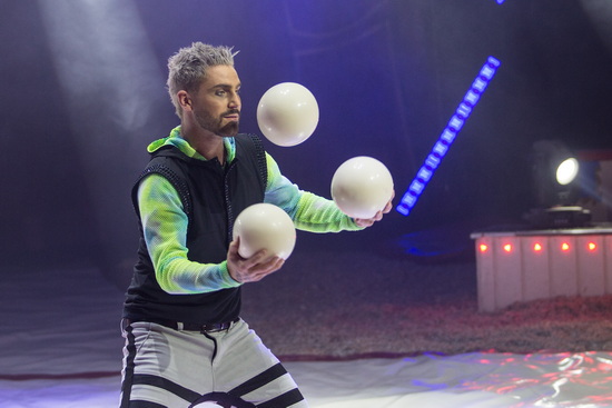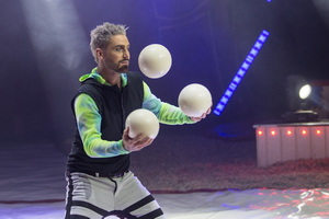 Variantenreich manipuliert Jongleur Zdenek Polach große weiße Gummibälle. Mit drei und vier Requisiten erfolgen die ersten Routinen. Dann steigert sich der Schwierigkeitsgrad über fünf auf sechs Bälle. Zum Höhepunkt des Auftritts hält der Jongleur kurz sieben Bälle in der Luft, von denen vier aus einem Metallgestell, das er um die Hüfte schnallt, in das Muster eingefügt werden.