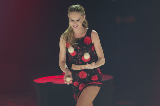 Elena Gamby jongliert mit Ringen und kleinen Bällen. Einige Quick-Change Tricks lockern die Jonglagen, die teils auch im Spitzentanz vorgetragen werden, auf. Im zweiten Teil ihrer Darbietung jongliert die junge Frau bis zu sieben Bälle über den Boden.
