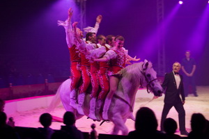 Völlig zu Recht beschließt die rasante Stehendreiterei die Nummernfolge. Salti neben dem Pferd, auf dem Rücken des Pferdes und von Pferd zu Pferd werden erstklassig in der Ausführung geboten. Zwei-Mann-Hoch und etliche weitere Tricks komplettieren die Nummer. Der abschließende Sprung aller Truppenmitglieder auf den Pferderücken zum Ritt zu fünft begeistert die Zuschauer immer wieder aufs Neue.