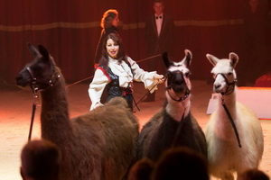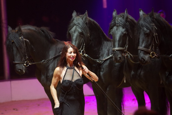Sandrine Bouglione ist mit zwei Dressurnummern präsent. Zunächst leitet sie ruhig und souverän vier junge Lamas zu ihren Figuren an. Wenig später zeigen vier nachtschwarze Friesenhengste unter der eleganten Peitschenführung der erfahrenen Dresseurin ihr Können. Vielfältige Figuren werden in souveräner Manier dargeboten.