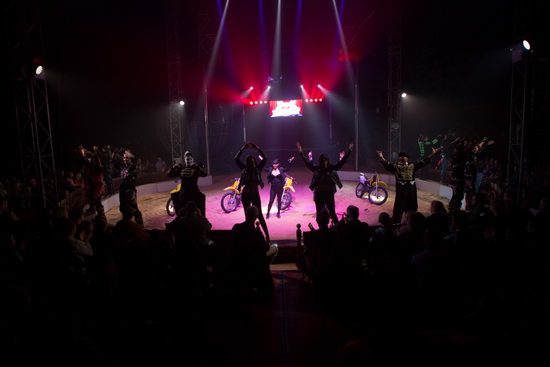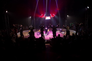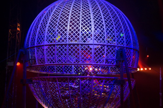 Vor dem Finale wird die Stahlgitterkugel flott aus der Manege entfernt und eine kleine Lasershow überbrückt die Aktion.