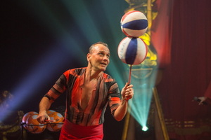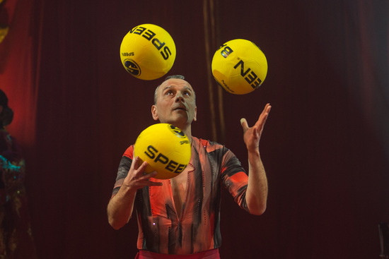 Vor der Pause erleben wir Ivan Radev mit seinen fulminanten Ball-Jonglagen. Tempo geladen werden die leuchtend gelben Fußbälle manipuliert, wobei der Jongleur höchst variantenreich zu Werke geht. Fünf, im Schwarzlicht rot leuchtende Bälle bilden einen besonders effektvollen Anblick. Im zweiten Teil seines Auftritts rotieren Bälle auf kurzen Stäben ähnlich Devil Sticks und zum Höhepunkt rotiert ein Turm aus drei Bällen auf einem Stab.