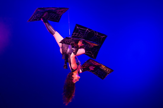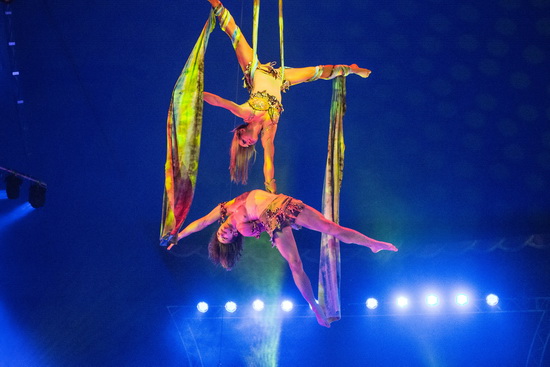 Tarzan und Jane, alias Francesco Nock und Simona erzählen ihre Love-Story an den Tuchstrapaten. Romantisch wird die Geschichte von werben der Geschlechter umeinander umgesetzt. Elegant erfolgen die Partnertricks und kraftvoll gestaltet „Tarzan“ seine Soloszenen. Im Verlauf der umfangreichen Trickfolge übernehmen beide Akteure die Rolle des Porteurs und mit weiten Flügen füllen sie den gesamten Raum der Kuppel.