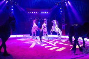 Franziska Nock präsentiert eine sehr interessant zusammengestellte Freiheitsdressur. Drei Friesen und drei weiße Hengste absolvieren eine abwechslungsreiche Laufarbeit. Souverän lässt die erfahrene Tierlehrerin die vielfältigen Muster ablaufen. Zwei Kamele gesellen sich zu den Pferden und bald darauf wird die Nummer noch um zwei Esel erweitert. Die unterschiedlichen Tierarten lassen viele verschiedene Kombinationen zu und mit prächtigen Da Capo Steigern findet der Auftritt seinen gelungenen Abschluss.
