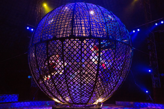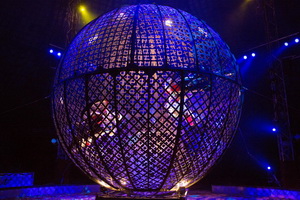 Vor der Pause erleben wir die spektakulären Fahrten des „Team Stoichev“, nun zu dritt, im Globe of Speed. In bekannter Manier jagen die Fahrer auf teils einander kreuzenden Bahnen durch die Stahlgitterkugel. Besonderer Nervenkitzel kommt auf, wenn eine junge Frau mitten im Globe stehend von den haarscharf vorbeifahrenden Motorrädern umrundet wird.