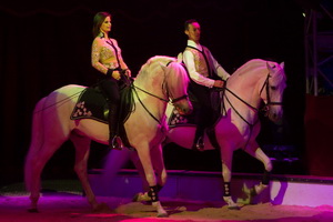 Im zweiten Programmteil reiten Franziska Nock und Paolo Finardi eine doppelte Hohe Schule. In sehr eleganter Aufmachung bieten die Reiter ein umfangreiches Repertoire erstklassig ausgeführter Schulschritte dar. Während Franziska Nock ihr Pferd wechselt, den zweiten Teil der Darbietung gestaltet sie solo, zeigt sich ein weißes Pony als eifriger Steiger.