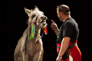 Zunächst ist Esel Manolito sein Partner auf der Bühne. Als sprichwörtlicher Vertreter seiner Rasse und bringt er seinen Vorführer das ein oder andere Mal an den Rand der Verzweiflung. Lachen, aus der Flasche trinken, einen Teppich aufrollen, abliegen und steigen sind neben anderen die Tricks, die spielerisch ausgeführt werden.