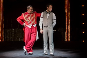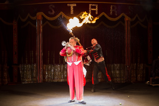 Tim Timothy stimmt auf seiner Trompete „My Way“ an und der Gitarrist und das Orchester begleiten ihn, derweil die Artisten noch einmal vor den Vorhang kommen und ringsum auf dem Bühnenrand Platz nehmen.