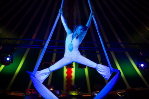 Salima Folco bezaubert die Zuschauer mit ihrem äußerst stimmigen Auftritt an den Vertikaltüchern. Große Leistung gepaart mit erstklassiger Präsentation und hervorragender musikalischer Begleitung ziehen das Publikum in ihren Bann und vermitteln in idealer Weise den Traum vom Fliegen.