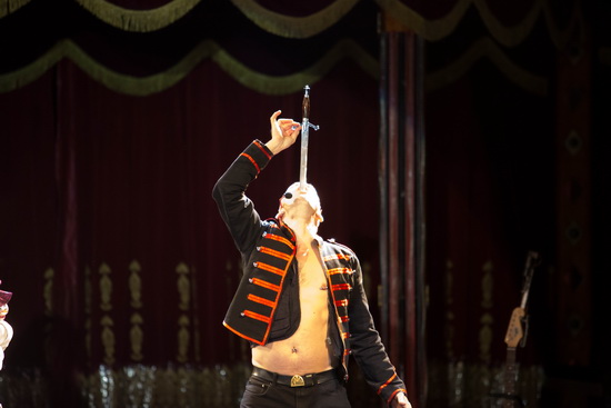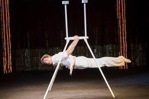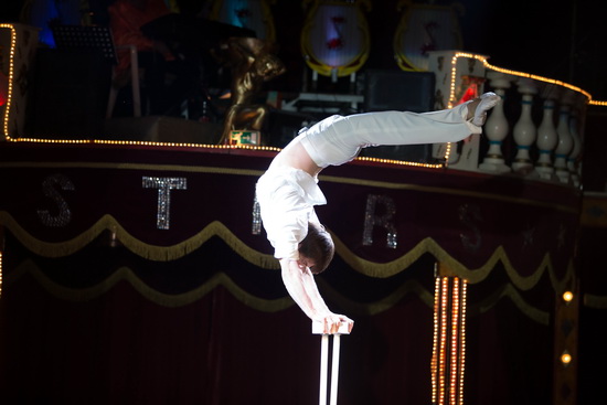 Maxim Bondarenko fasziniert mit einer spielerisch wirkend, perfekt vorgetragenen Handstand-Equilibristik. Anspruchsvolle Posen und Übergänge werden kraftvoll-elegant mit großer Selbstverständlichkeit gearbeitet. Ein eigenwilliges, luftig leichtes Requisit, vier dünne Metallbeine münden in einen ebensolchen Ring worauf die Stäbe mit den Handklötzen angebracht sind, lässt eine Reihe außergewöhnlicher Abläufe und Positionen zu. Mit einem „Klötzchensturz“ findet diese hervorragende Darbietung ihren gelungenen Abschluß.