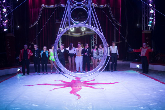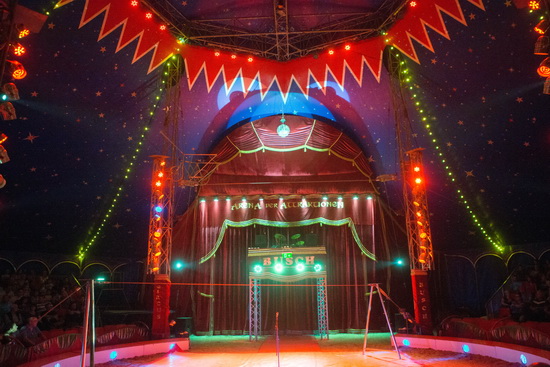 Beherrscht wird der Raum vom prächtigen, voluminösen Artisteneingang, der bis unter das hohe Zeltdach emporragt. Dunkelroter edler Samt und reiche goldene Bordüren und Applikationen strukturieren die Flächen. Ein elegant gebogener Baldachin bildet den oberen Abschluss und in gestickten goldenen Lettern leuchtet der, von zahlreichen Scheinwerfern angestrahlte Schriftzug „Arena der Attraktionen“ in den Raum. Auf einem hoch vor die Gardine gebauten Podium hat die kleine aber feine Live-Band des Circus ihren Platz.