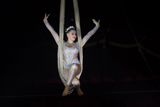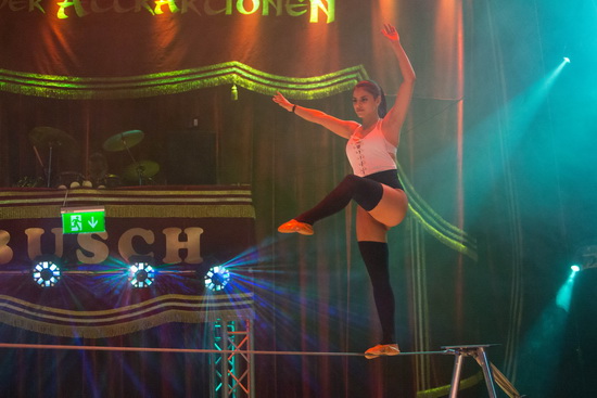 Die artistische Eröffnung des Abends obliegt Joana Camadi mit gekonntem Tanz auf dem gespannten Silberdraht. Mit großer Sicherheit und temporeich erfolgen die zahlreichen Evolutionen. Ein Stand im Spagat, Rad schlagen, ein elegantes gleiten in den Spagat und viele weitere klassische Elemente gehören zum Gebotenen.