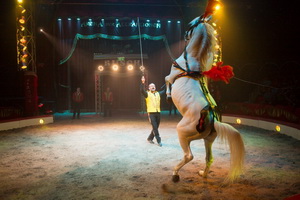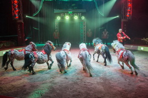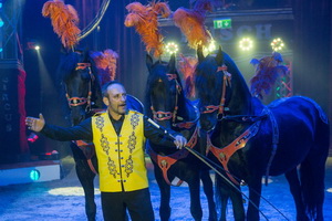 Clown „Hansi“ erobert das Mikrofon und ficht einen heroischen Kampf gegen die Tücke des Objekts, ehe er seinen Platz Direktor Henry Frank überlässt, der das „hochverehrte Publikum“ begrüßt. Wir erleben den Chef des Hauses als äußerst angenehmen und versierten Manegensprecher, der seine Künstler eloquent vorstellt und vielerlei Informationen zu vermitteln weiß. Das Ballett des Hauses performt zum Opening in der Manege währenddessen ein Friesenhengst und ein Kamel eine Runde zwischen Logen und Gradin laufen.