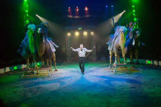 Tierlehrer Gitano Frank präsentiert in einem abwechslungsreichen Ablauf den Exotenzug des Hauses. Zunächst sind vier mächtige Steppenkamele, die mit Schabracken im Zebra-Look geschmückt sind, mit vielseitigen Lauffiguren zu erleben. Souverän lässt der versierte Vorführer die Figuren in flotter Abfolge ausführen. Im weiteren Verlauf des Auftritts ist das Ballett als Figurantinnen in die Darbietung involviert. Schließlich kommen sechs Rinder unterschiedlicher Rassen hinzu und komplettieren das imposante Tableau.