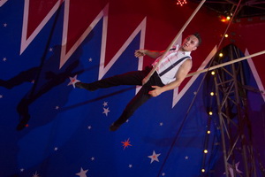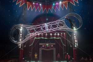 Zu Beginn des zweiten Programmteils glänzt Benito Frank mit seiner fulminanten Darbietung am Schwungseil. In sehr hohem Tempo und in größtmöglicher Höhe lässt er das Requisit bis weit über die Logen ausschwingen. Überschläge mit dem Seil und frei ausgeführte Balancen wechseln mit zahlreichen risikoreichen und völlig ungesichert ausgeführten Abfallern ab. Ein erstklassiger Auftritt in einem kaum noch zu sehenden Genre. Chapeau.