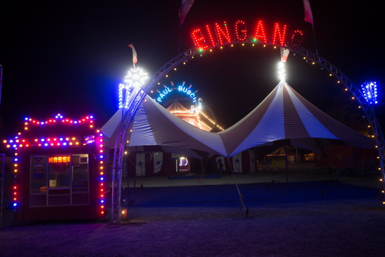 Die gesamten Zeltanlagen glänzen in einem rot-weißen Streifendekor und sind mit blauen Applikationen verziert. Hinter einem weitgespannten Vordach steht das geräumiges Vorzelt. Die Spielstätte ist ein Chapiteau von zweiunddreißig Metern Duchmesser mit achteckiger hoher, spitzer Kuppel. Beide Zelte werden von hohen Gitterrohrbögen überragt an den die Leuchtschriften „Circus Palast“ und „Paul Busch“ in der Dunkelheit dank moderner LED-Technik weithin strahlen. Lichterketten an den Abseglungen, Leuchtpalmen auf allen Mastspitzen und unzählige Lichter an den Fassadenwagen, der Kasse und am Zaun transportieren in der Dunkelheit den Zauber des Circus.