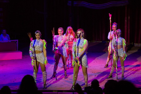 Während des Einlasses illuminieren Lichterketten mit gelben Glühbirnen das Zelt mit ihrem warmen Licht und Lichtoperator Jeffrey Frank setzt, mittels der mit moderner Technik ausgerüsteten Lichtanlage, die Show erstklassig in Szene.