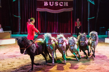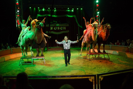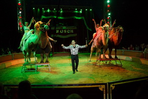 Mit dem großen Exotenzug des Hauses, vorgeführt von Gitano Frank, startet die unterhaltsame Spielfolge. Vier mächtige, mit Schabracken im Zebra-Look geschmücke, Steppenkamele sind zunächst mit vielseitiger Laufarbeit zu erleben.