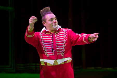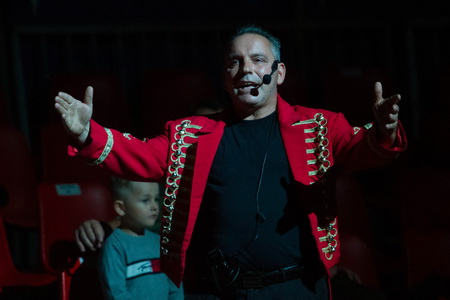 Das Innere des Chapiteau wird vom prachtvollen, riesigen Artisteneingang, der bis unter das hohe Zeltdach emporragt beherrscht. Dunkelroter edler Samt und reiche goldene Bordüren und Applikationen strukturieren die Flächen. In gestickten goldenen Lettern leuchtet der, von zahlreichen Scheinwerfern angestrahlte Schriftzug „Arena der Attraktionen“ in den Raum. Auf einem hoch vor die Gardine gebauten Podium hat die Live-Band in Person von Emilio Frank ihren Platz. Mit Hilfe einer leistungsstarken Tonanlage, perfekt ausgesuchten Begleitmusiken und dem gekonnten Schlagzeugspiel des jungen Mannes wird die Show mit einem volltönenden Klangteppich, der notwendigen Individualität bietet, untermalt.