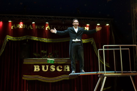 Einen weiteren Comedy-Act bietet Marcello Frank auf dem Trampolin. In seiner Rolle als „angeheiterter Herr“ hat er zunächst „Probleme“ mit dem Requisit, ehe es mit reichlich Slapstick-Komik gewürzter Akrobatik auf dem elastischen Tuch und am Sprungturm zur Sache geht. Zahlreiche Saltos und Kaskaden werden geboten und selbstverständlich darf der obligatorische Striptease nicht fehlen.
