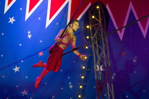 Mit der fulminanten Schwungseil-Nummer von Benito Frank startet der zweite Programmteil. In sehr hohem Tempo und in größtmöglicher Höhe lässt er das Requisit bis weit über die Logen ausschwingen. Überschläge mit dem Seil und frei ausgeführte Balancen wechseln mit zahlreichen risikoreichen und völlig ungesichert ausgeführten Abfallern ab. Ein erstklassiger Auftritt in einem kaum noch zu sehenden Genre.