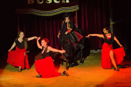 Im weiteren Programmverlauf reitet Deborah Lauenburger auf einem prachtvollen Friesenhengst gekonnt Hohe Schule. Im spanischen Stil werden die Lektionen vorgetragen und drei „Flamenco-Tänzerinnen“ runden das Bild ab.