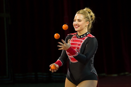 Gekonnte Tempojonglagen sind das Metier von Celine Köllner. Zu fetzigen Rock n' Roll Melodien tanzt die charmante junge Frau durch die Manege, manipuliert sicher und schnell Tennisbälle, Ringe, Keulen und Fußbälle. Die abschließenden Muster erfolgen als Bouncing-Jonglage.