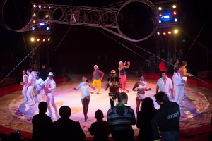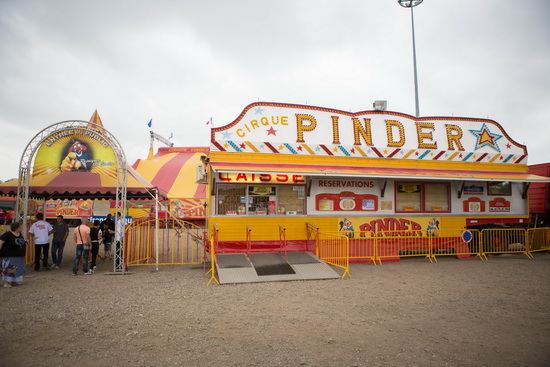 Auf dem weitläufigen Messegelände, weit außerhalb der Stadt empfing die große gelb-rote Zeltstadt in gewohnter Weise die Besucher. Das große Chapiteau mit dem markanten Blockstreifendekor beherrscht den Platz. In der langgestreckten Front ist der große dekorative Kassenauflieger das zentrale Element. Entlang der rechten Platzseite ist die lange Reihe Sattelzüge mit angekuppelten großen Anhängern aufgefahren, die die Mannschaftsquartiere beinhalten. Betriebsküche, Sanitärwagen und das „Atelier Mechanique“ sowie ein Elektrozentrale vervollständigen diesen Bereich. Gleich im Anschluss haben die Wohnwagen der Artisten ihren Platz.