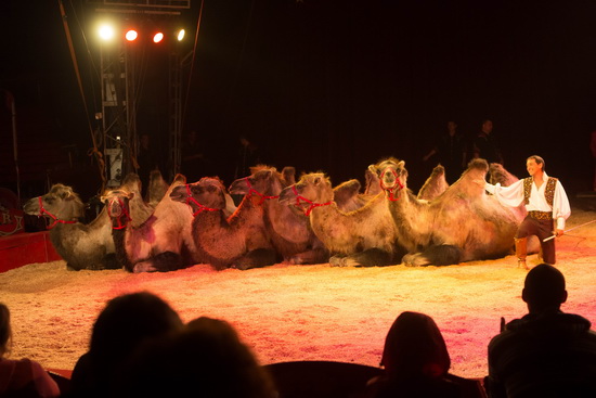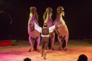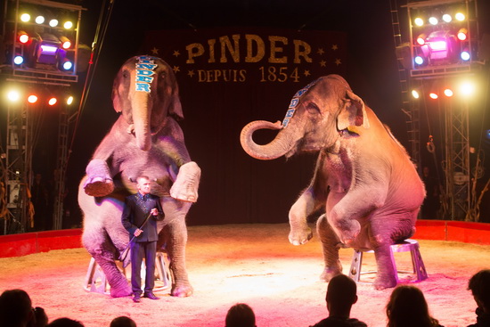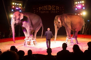Mickael Brady präsentiert die beiden indischen Elefanten, Dehli und Saba, des Cirque Pinder. In einem tiergerecht gestalteten Ablauf bieten die beiden großen, gewichtigen Damen Laufarbeit und einen Hochsitzer in der Manege. Körperlich werden sie in keiner Weise überfordert und das abliegen über dem Vorführer ist ein Highlight in dem souverän vorgetragenen Repertoire.
