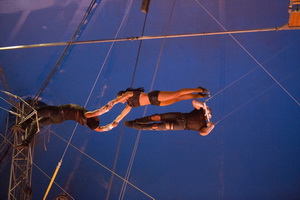 Am Fliegenden Trapez ist die kubanische Formation „The Flying Black Street“ vor der Pause zu sehen. Ein zweiter Fänger, fest über dem Fliegertrapez platziert, bietet den vier Flieger/Innen zusätzliche Flugmöglichkeiten. Die Sprünge werden sowohl vom Trapez, als auch zwischen den Fängern ausgeführt. Die verschiedenen Saltos werden erstklassig ausgeführt und allesamt sicher gefangen. Eine Fliegerin bietet mit einem hervorragenden Doppelsalto und ihrem Sprung in der Passage Highlights der Darbietung. Einer der Herren glänzt mit einem dreifachen Salto.