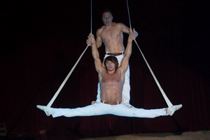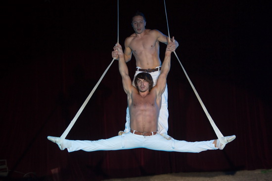 Das Duo „Just two Men“, Artem Lyubanevych und Oleg Shakirov, arbeitet eine äußerst trickstarke Nummer an den Strapaten. Ungeheuer kraftvoll absolvieren die beiden ukrainischen Artisten ihren Auftritt. Typische Abläufe des Genres werden mit zahlreichen Hand-auf-Hand Tricks abwechslungsreich kombiniert und in Perfektion vorgetragen.
