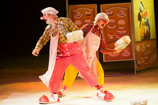 Die Clowns „Los Pepes“ sind mehrfach zu erleben. August „Pepino“ überbrückt mit einem großen Ballon im Zusammenspiel mit den Zuschauern den Aufbau des Sicherheitsnetzes für das Fliegende Trapez. Des Weiteren veranstaltet er im ersten Programmteil mit seinen „Pepe Films“ ein großes „Hollywood Casting“. Zusammen mit drei Zuschauern wird eine weitere, flott ablaufende Version der „Filmszene“ geboten. Im zweiten Programmteil erleben wir das Duo mit klassischer Clownerie. Zusammen mit seiner Partnerin bringt Pepe das Entree „Patisserie“, eine Variante der Restaurant-Szene, in der Monsieur Loyal Judicael Vattier den Part eines weißclowns übernimmt. Temporeich und turbulent geht es in der Manege zu, wenn die beiden Auguste mit viel Klamauk ihre Gags zünden und das Publikum geht ausgelassen, wie auch bei den beiden Auftritten, mit. Ohne Längen steuert das straffe Spiel auf die Pointe zu und mit einem temperamentvollen Lied auf der Trompete verabschieden sich die Clowns.