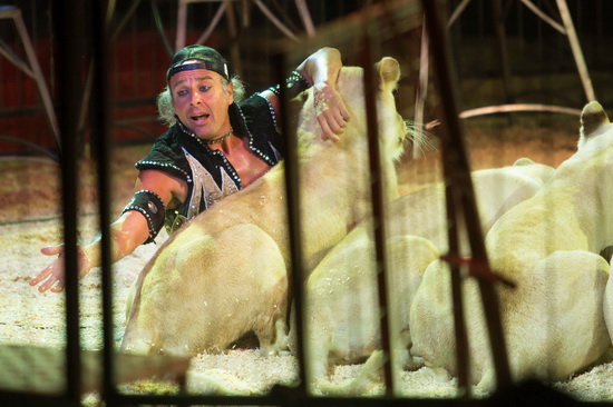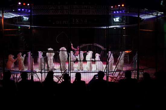 Aus dem Off kündet „Monsieur Loyal“ eines der Highlights des Programms an und im aufflammenden Licht kommen die zwölf weißen Löwen in die Manege. Traditionell beginnt die Soirée bei Pinder mit der Raubtierdressur von Frédéric Edelstein. Die große Pyramide aller Tiere steht am Beginn der Vorführung, die den Juniorchef stets temperamentvoll und mit viel Tempo agieren sieht. Verschiedene Hochsitzer und Scheinangriffe, Fächer und Löwenbar sind weitere Elemente dieser hervorragenden Darbietung. Drei Löwinnen zeigen nacheinander temperamentvolle Hinterbeinläufe. Mit den letzten fünf Tieren bietet Edelstein einen spektakulären, nur selten zu sehenden Trick. Er legt sich rücklings in den Manegensand und lässt sich von den quer über ihm liegenden Löwen zudecken. Mit Sprüngen über den sich niederwerfenden Dompteur hinweg findet der Auftritt seinen idealen Abschluss.