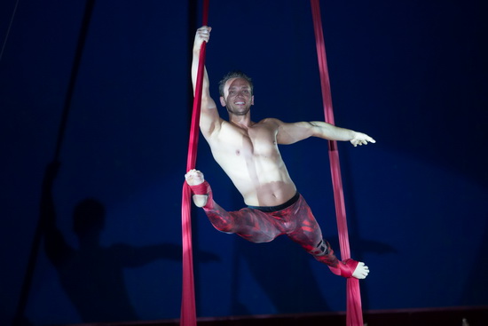 Valeriy überbrückt den Käfigabbau mit seinem Auftritt an den Strapatentüchern. Der ruhig und tänzerisch gestylte Auftritt bietet neben vielen kraftvollen Halteelementen mit einigen Abfallern auch den notwendigen Nervenkitzel.