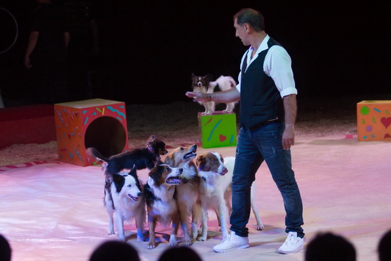 Zwei Mal ist Sandro Montez mit seinen Vierbeinern zu erleben. Im ersten Teil präsentiert er eine neu einstudierte Darbietung mit fünf Hunden unterschiedlicher Größe und Rasse. Voller Temperament und in unglaublichem Tempo absolvieren die großen Hunde ihr Repertoire, reißen mit ihrem Eifer und der enormen Spielfreude das Publikum förmlich von den Sitzen.