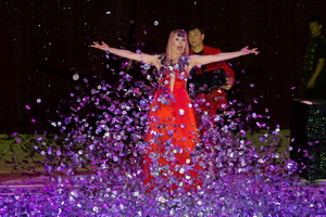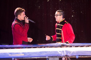 Der Quick Change des Duo Monastyrsky kommt auf den Rängen bestens an. Blitzschnell wechseln beide Partner die eleganten Kostüme, die sich zunächst stilsicher auf die Farben schwarz und weiß beschränken. Zur Verblüffung des Publikums erfolgen die Wechsel wie von Geisterhand und zum Höhepunkt der Darbietung wechseln die Farben hin zu leuchtendem rot.