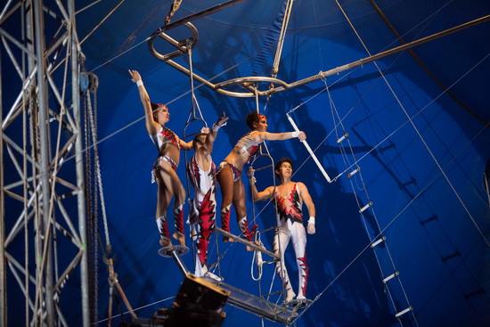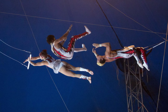 Traditionell ist in allen Pinder-Programmen eine Flugtrapez-Darbietung vor der Pause zu erleben. In diesem Jahr zeigen die aus Brasilien stammenden „Flying Sergio“ ihr Können in der weiten Kuppel. Je zwei Flieger und Fliegerinnen präsentieren eine Vielzahl verschiedener Tricks, darunter ein Doppelsalto einer der Damen. Ein gestreckter und ein gehockter Doppelsalto gehören gleichfalls zum Repertoire, das in einer Passage und dem abschließenden, erstklassig ausgeführten dreifachen Salto seine Höhepunkte hat.