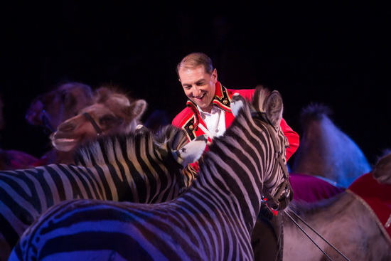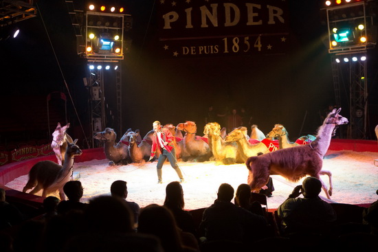 Wenig später präsentiert der versierte Tierlehrer den großen Exotenzug des Cirque Pinder. Neun Kamele und drei Norwegerpferde bilden einen formidablen Zwölferzug, der viele unterschiedliche Figuren sicher abläuft. Die Kamele liegen in einer langen Reihe, die zu beiden Seiten von Eseln flankiert wird ab und Lamas überspringen Barrieren. Die Pferde zeigen Steiger und zwei Zebras ziehen ihre Bahnen. Ein Lama setzt in einem gewaltigen Sprung über vier Esel hinweg.