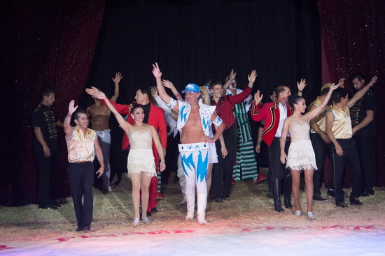 Das puristische Finale des Cirque Pinder läuft in bekannter schnörkelloser Weise ab. Die in der Manege versammelten Artisten werden vom Manegensprecher noch einmal kurz vorgestellt und mit knappen Worten bedankt man sich für den Besuch und verspricht ein Wiedersehen im nächsten Jahr.