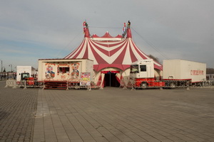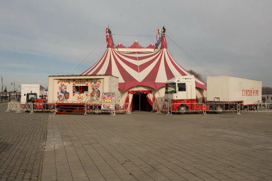 Das hohe Vier-Masten-Chapiteau beherrschte den Circusplatz. Der moderne Zeltbau, dessen rot-weiß gestreifte Plane bis zu den Mastspitzen empor reicht, wird von einer langen Kuppel mit drei Spitzen gekrönt und zahlreiche Flaggen wehen auf den Quertraversen der Masten. Der große Kassenwagen hatte seinen Platz unmittelbar vor dem Zelt. Die bunt bemalte Front und die funkelnden Lichter laden zum Besuch ein. Die cremeweißen Sattelzüge und Anhänger zeigen in großen roten Lettern den Circusnamen. Sie sind rings um das Chapiteau platziert und wie oftmals in unseren Nachbarländern praktiziert, ist dieses an den Fahrzeugen abgesegelt.