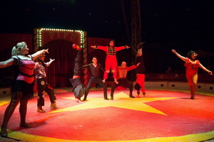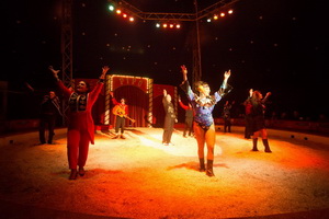 Clown Bram, ein junger Mann aus der Hafenstadt Brügge, treibt bereits vor dem Zelt seine Späße mit dem wartenden Publikum, während des Einlasses wuselt er zur Freude der kleinen Besucher in der Manege umher.