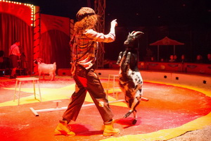 Mit der temperamentvollen Ziegen- und Hunderevue des Duo Tarantini setzt sich der Schwung des Opening fort. Zwei große Hunde und vier Ziegen unterschiedlicher Rassen zeigen in einem verspielten Auftritt ihr erlerntes Können. Sie überspringen Hürden, laufen auf den Hinterbeinen, bieten viele verschiedene Sprungvarianten, zeigen Balken- und Flaschenlauf.