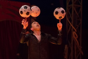Jongleur Rafael Gil startet seinen vielseitigen Auftritt mit einer variantenreichen Keulenjonglage. Vielseitige Routinen werden temporeich absolviert. Fünf Tennisbälle werden zum Abschluss der diversen Muster in Köchern, die an einem Gürtel befestigt sind, gefangen. Anschließend sind drei Fußbälle und ein Sprungseil die Mittel der Wahl. Überraschend der Schlusstrick dieser Passage, den man ansonsten nur mit Zigarrenkistchen sieht. Die abschließenden Touren werden mit Sombreros ausgeführt und lassen das Publikum, nicht nur bei der Runde durchs Gradin, begeistert mitgehen.