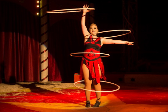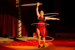 Natascha Heppenheimer bietet einen temperamentvollen Auftritt mit Hula Hoops. In vielfältiger Weise lässt die sympathische Artistin die Ringe um Arme, Beine und Körper kreisen.