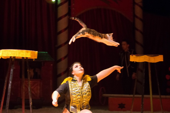 Nora Borissov präsentiert eine flott ablaufende Katzendressur. Die Stubentiger beherrschen ein umfangreiches Repertoire attraktiver Tricks und der Sprung durch einen Feuerreifen bildet den Höhepunkt des Auftritts.