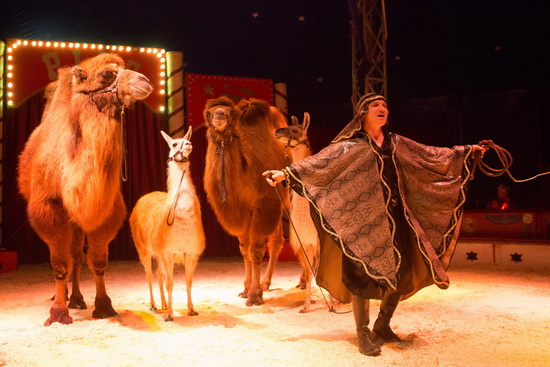 Im weiteren Verlauf des Programms präsentiert Anthony Tarantini zwei Kamele und zwei Lamas in einem gemeinsamen Ablauf. Variantenreiche Abläufe erfolgen in Gelassenheit und werden vom versierten Tierlehrer souverän abgerufen.