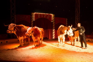Zu Beginn des zweiten Programmteils präsentiert Toni Heppenheimer vier mächtige rotbunte Ochsen. Gemächlich bieten sie ihr umfangreiches Repertoire an Lauffiguren.